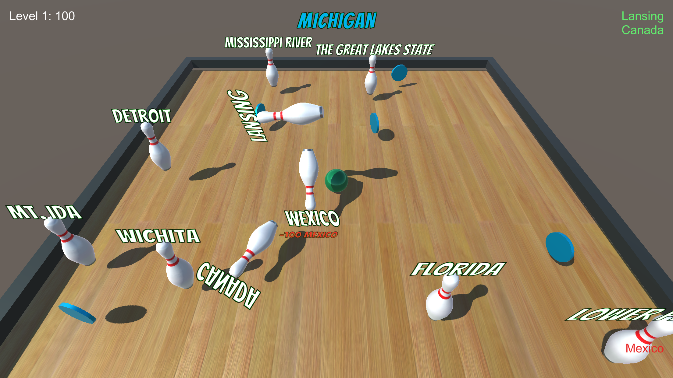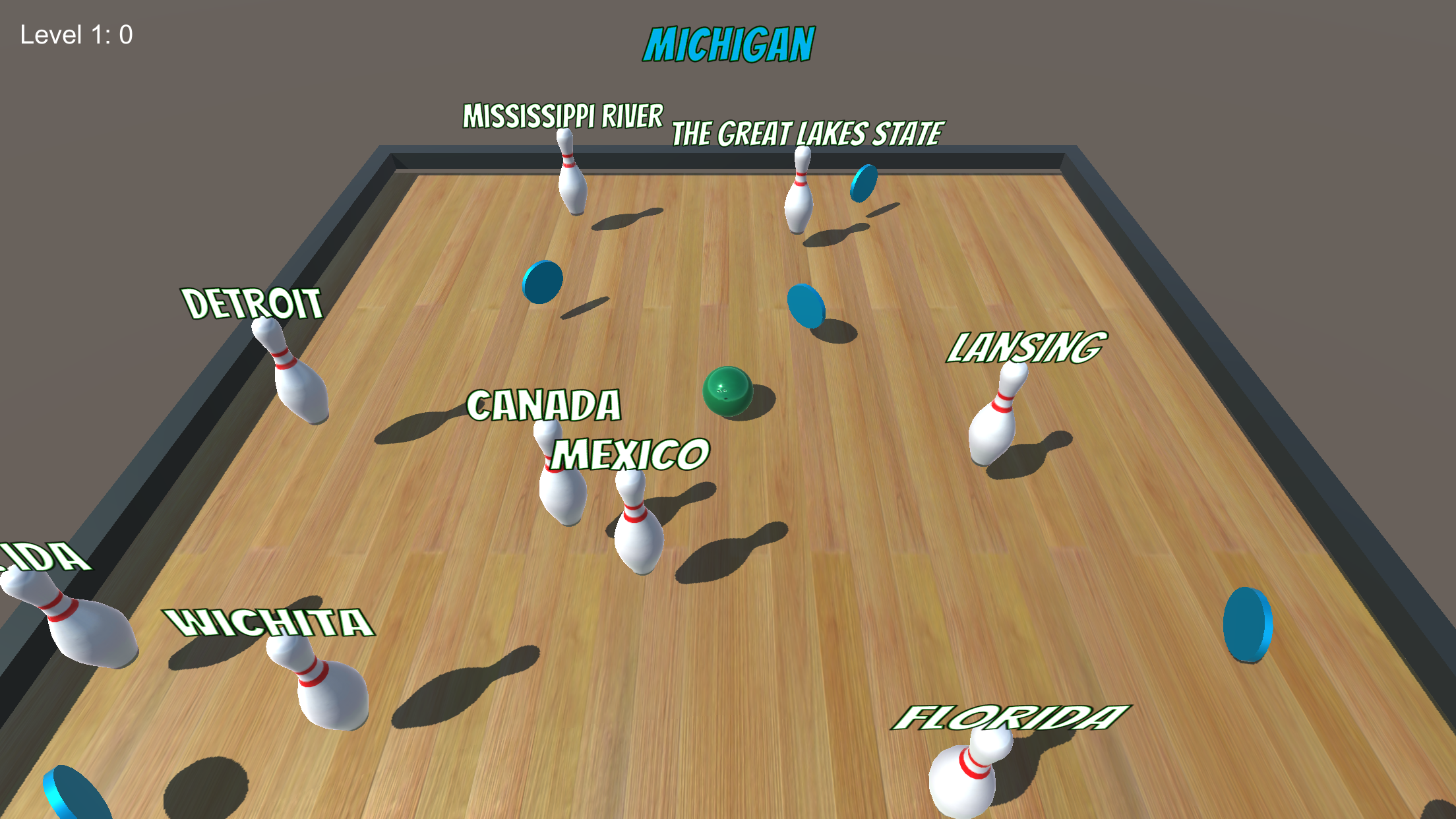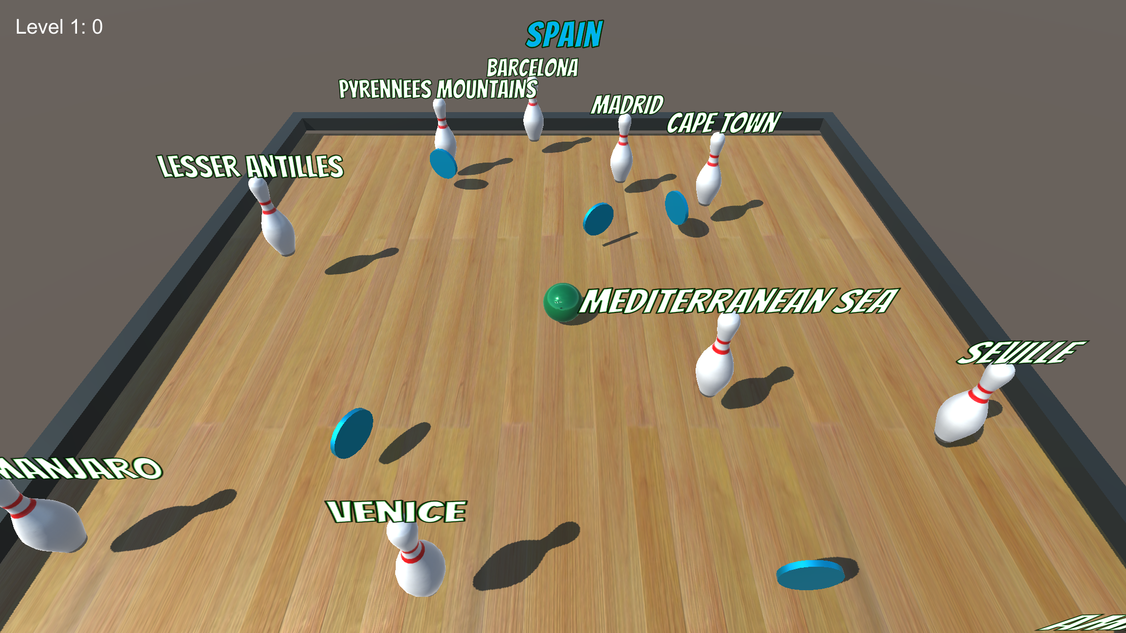 Geo Bowling began as a fun “HackFest” week project at my place of employment. With the goal of writing a 3D cross-platform game, I delved into Unity, using the 2018.4.13f1 Personal version. I would like to thank Bee, Papaya, Pal and Vi for their tireless effort compiling data, testing and coming up with enhancements for this app. Thank you, girls! You inspire and motivate me.