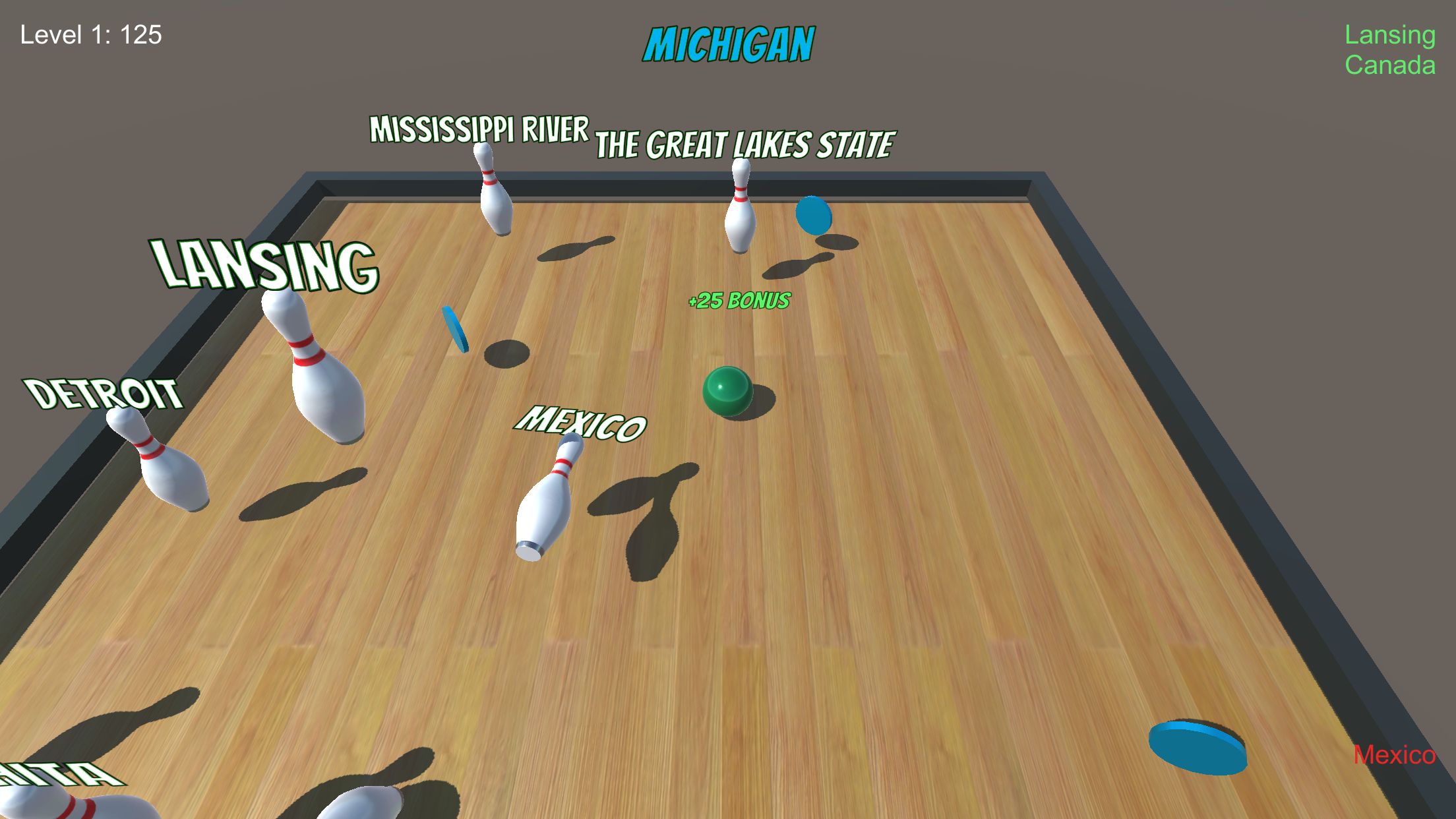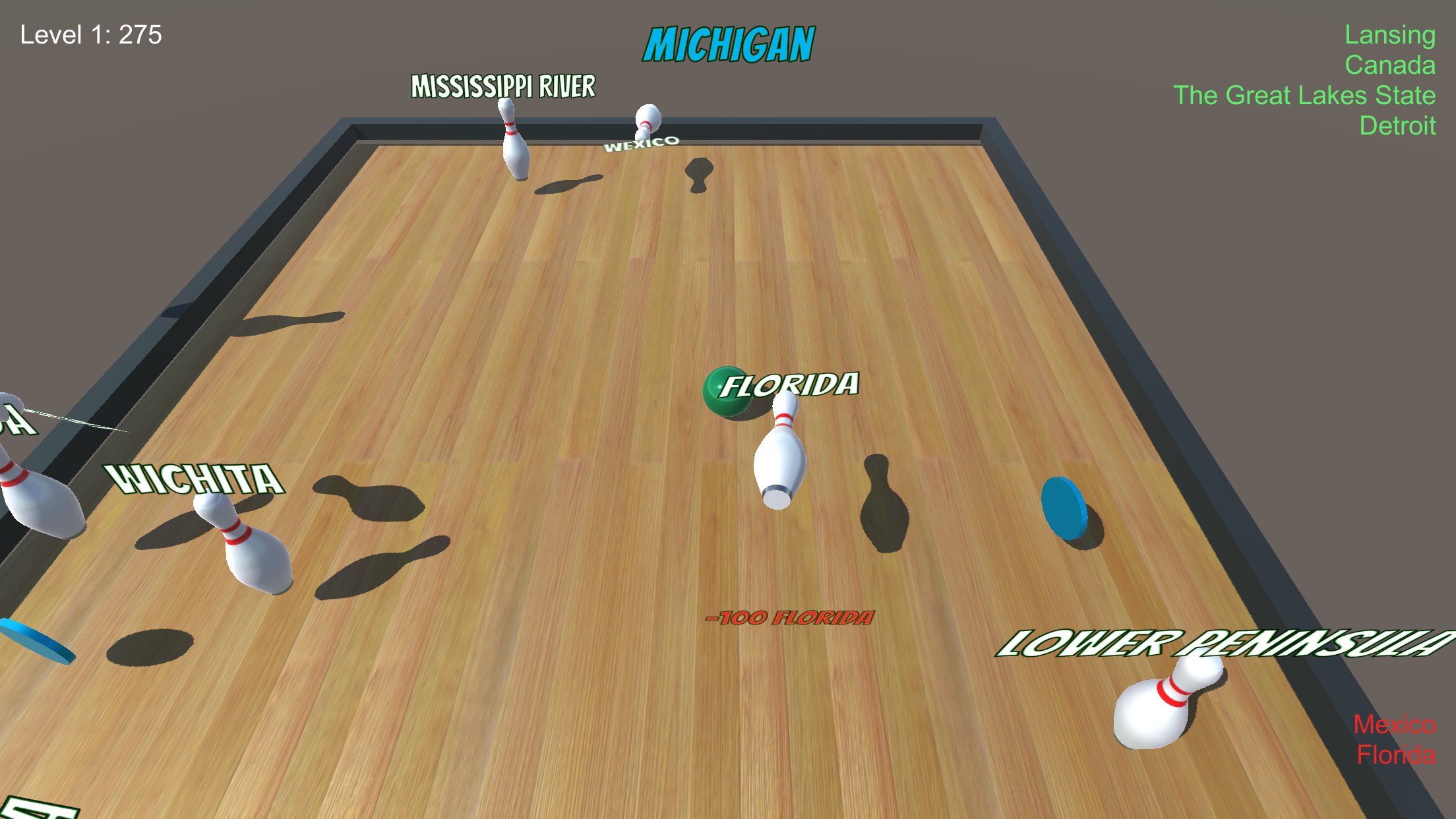 Knock into pins that are a match as a border, major city, site, state nickname or geographic feature of the randomly selected state. Earn points for correct matches and bonus points for knocking a match into another match or collecting blue chips. Advance to the next state if you’ve earned enough points. Be careful, hitting wrong pins will cost you. Every fifth level is a free bowl!