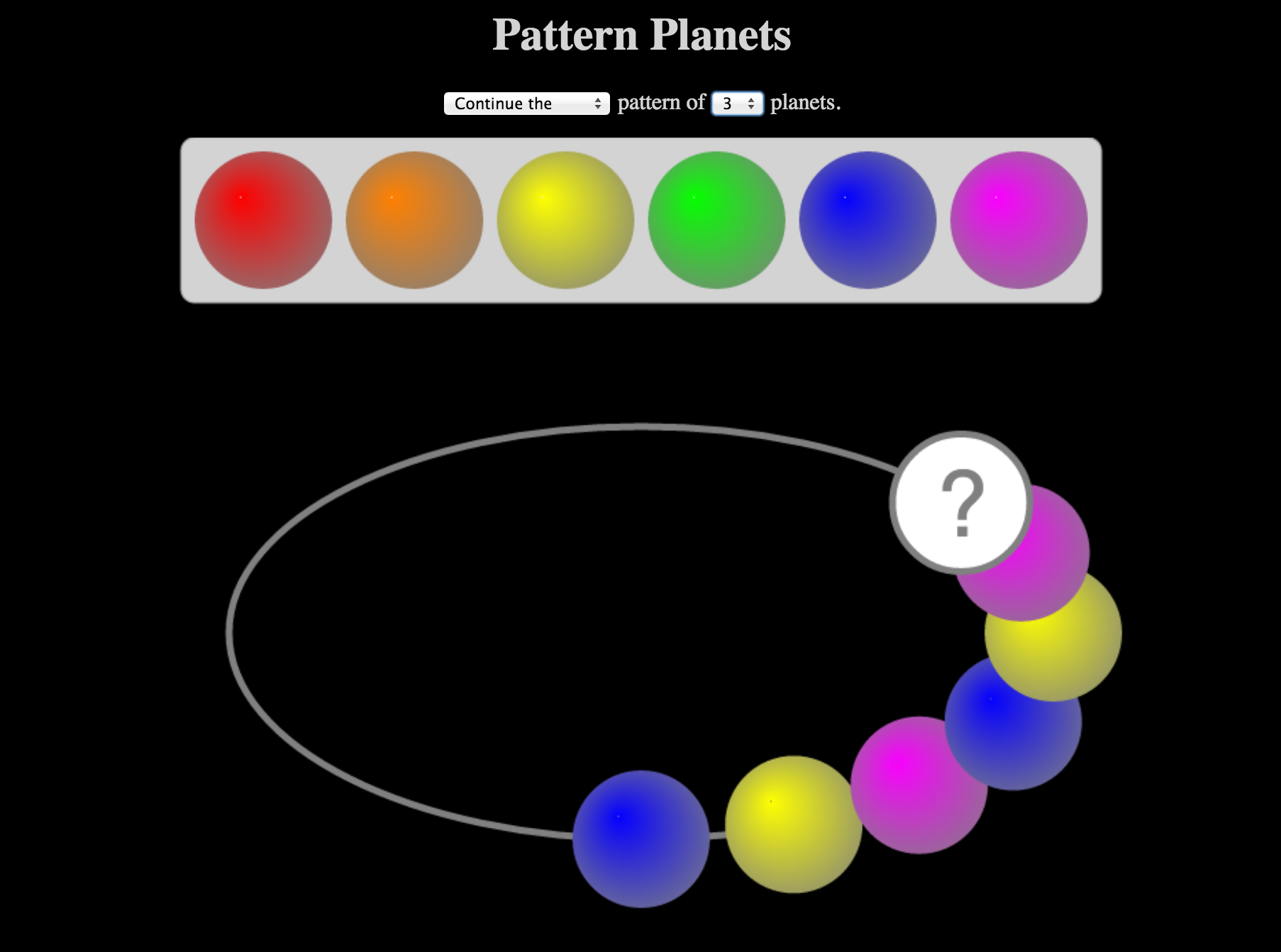 - Continue the pattern by dragging a planet from the planet palette to the target marked by the question mark.