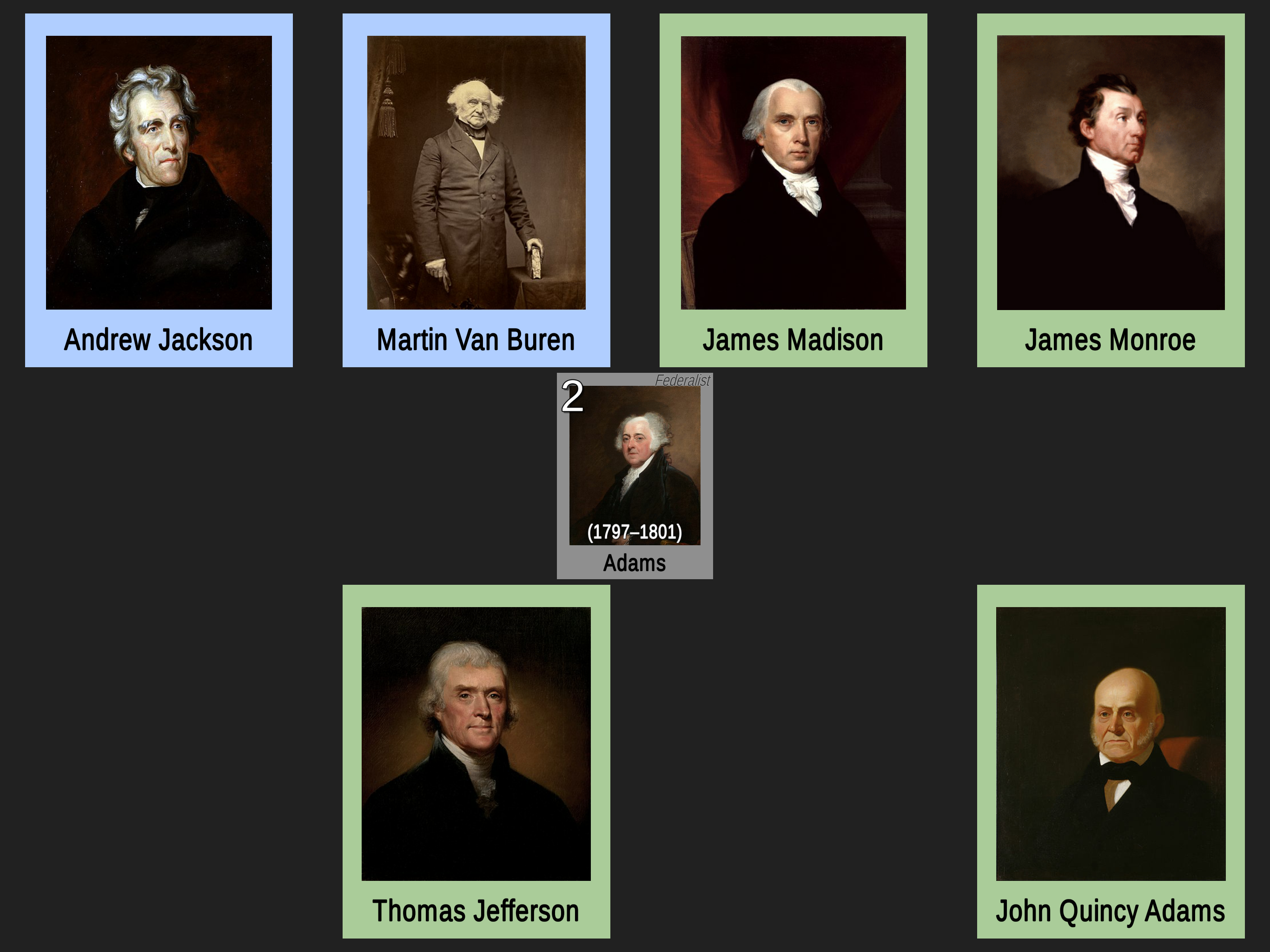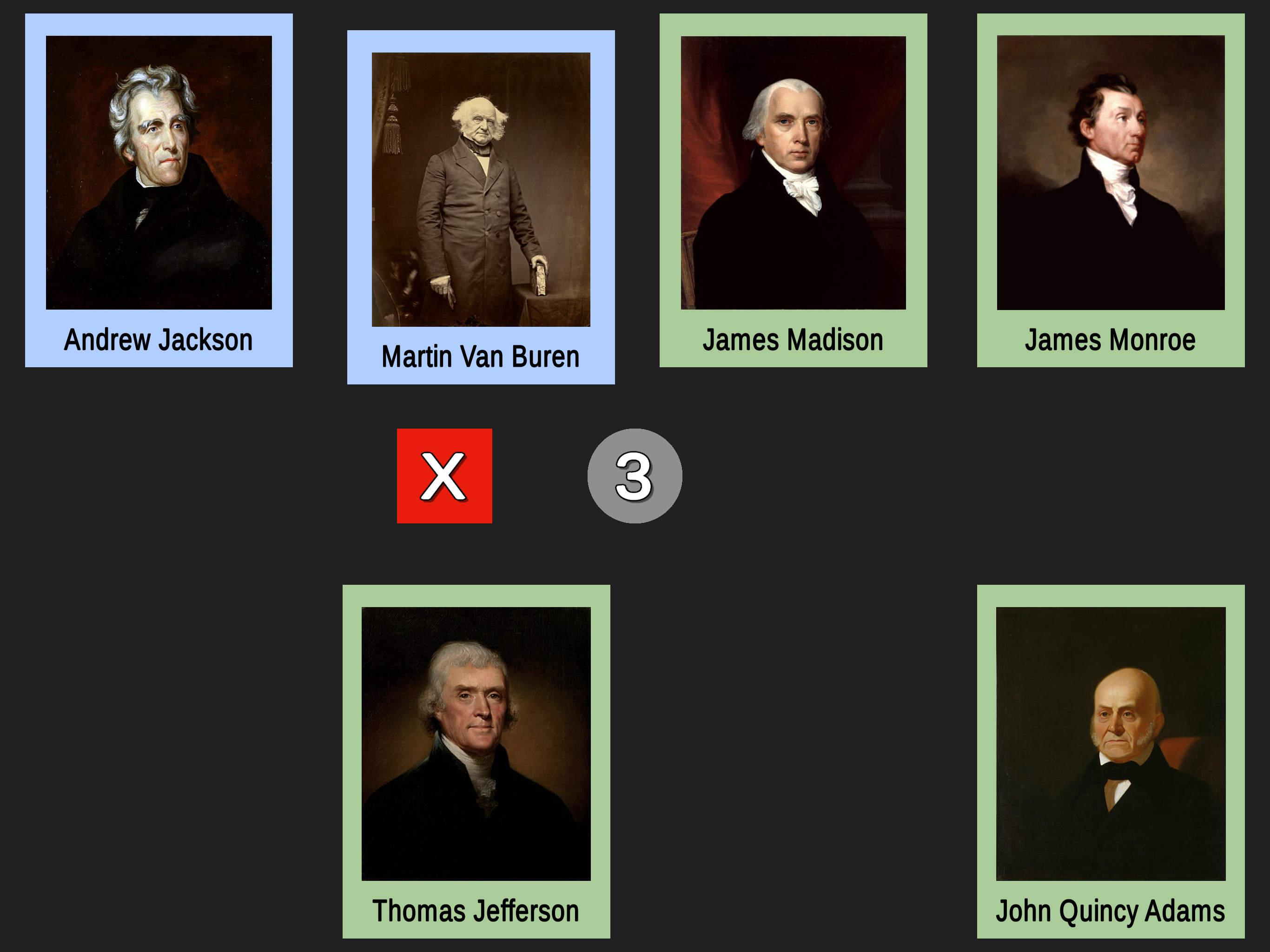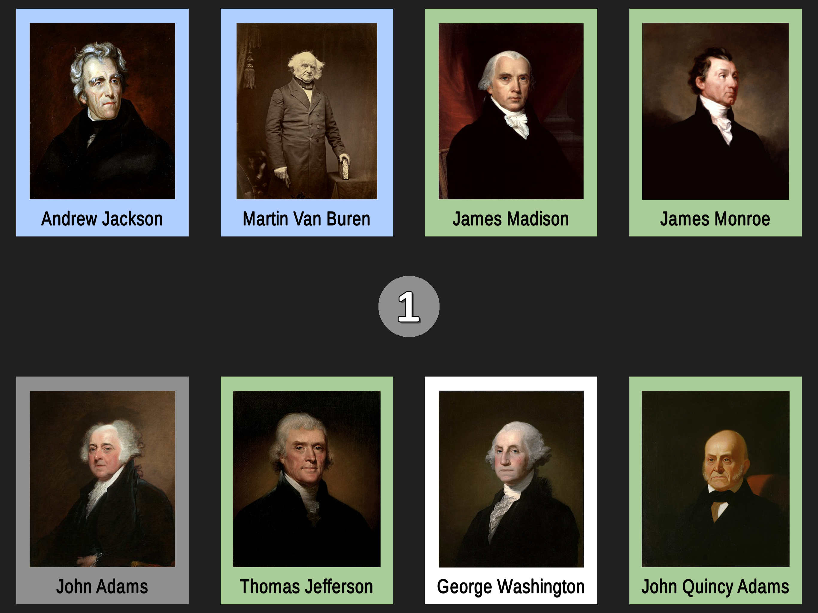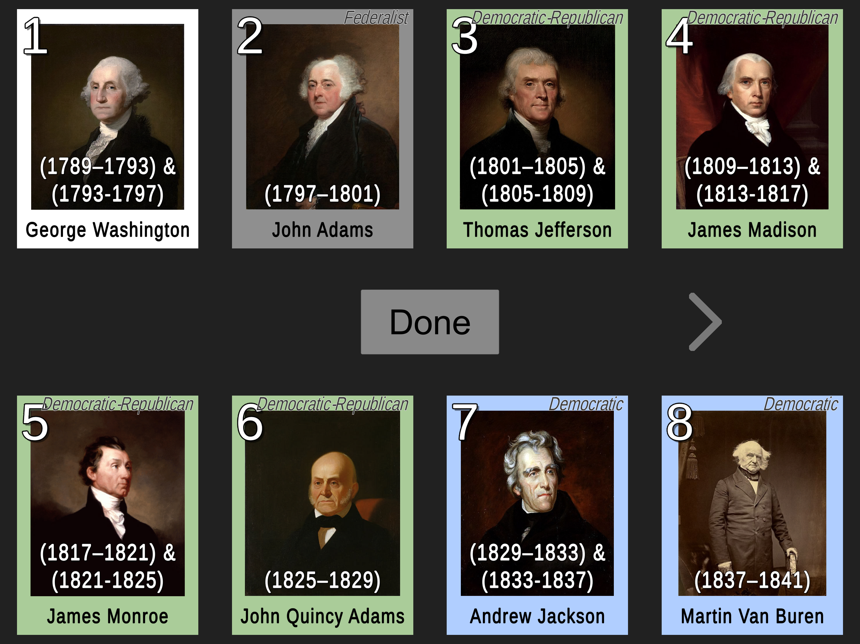A page of cards for each of the first 8 presidents will be shown in random positions on your screen. Each card is color-coded to represent the political party and only their portrait and full name are shown. Drag the POTUS whose sequence number in the order of presidents matches the badge number in the center of the screen. For example, if the badge shows 1, drag George Washington’s card to it because George Washington is the 1st president. Complete all the presidents on the page to advance to the next set.