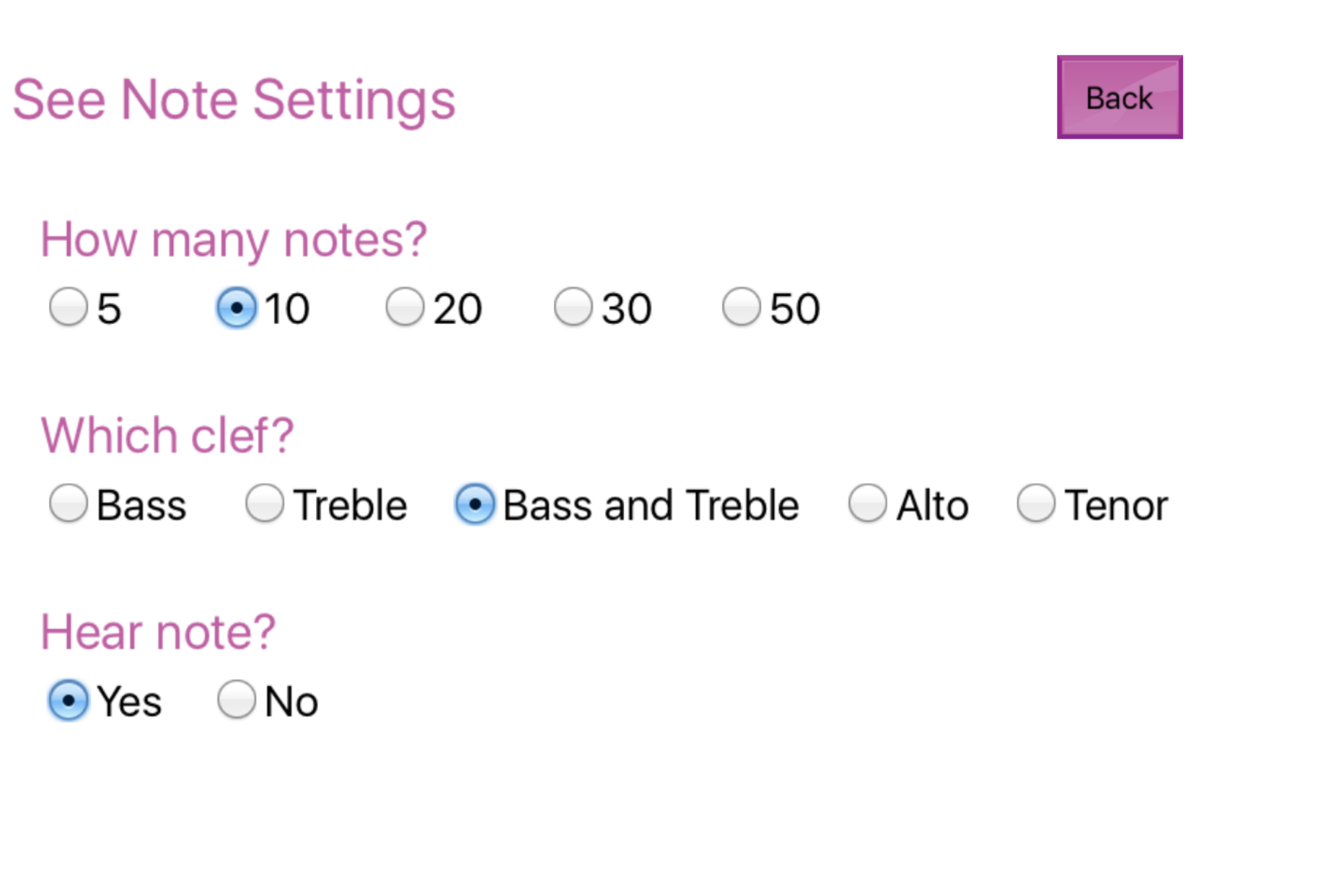 Prefer to work on just the treble clef or just the bass clef? Settings allow you to choose. You can even try alto or tenor clef. Settings also allow you to choose whether you hear the note and how many notes are in the set. Have fun with note identification!